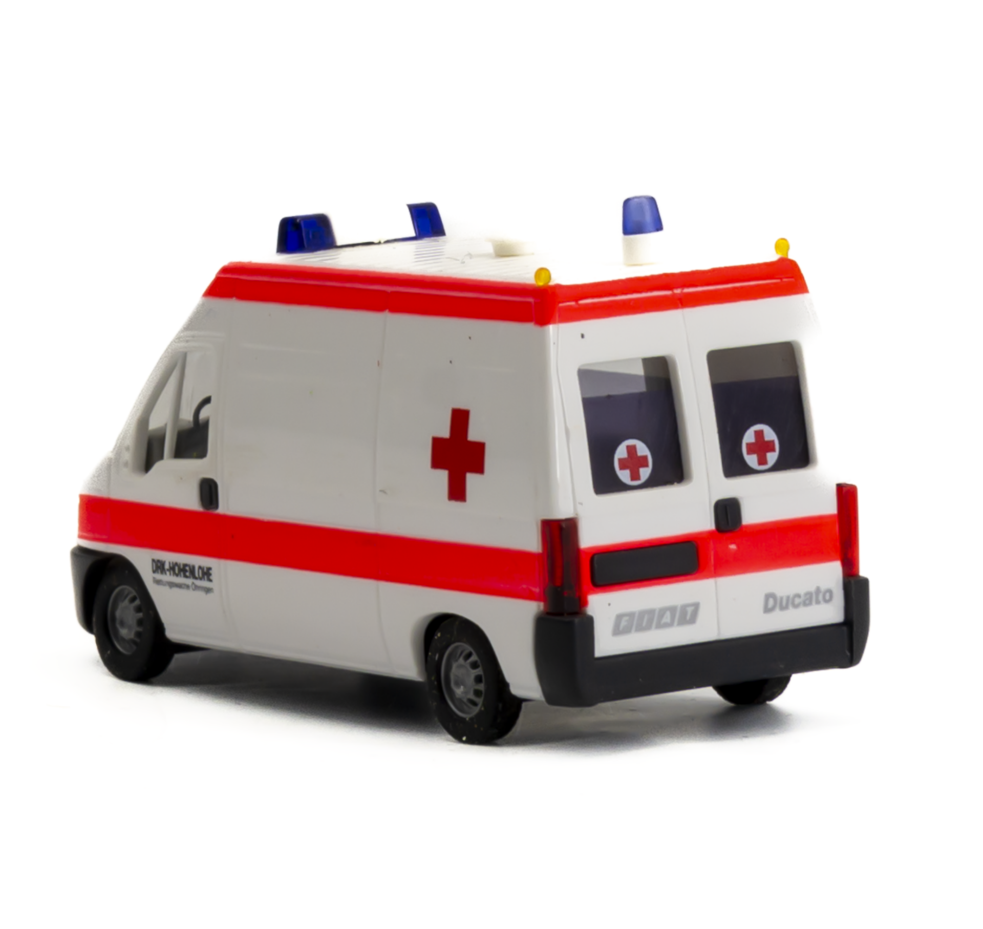 De Busch 47314 Fiat Ducato in de opvallende uitvoering van het Deutsches Rotes Kreuz (DRK) Kreisverband Hohenlohe is een bijzonder gedetailleerd modelvoertuig in H0-schaal (1:87). Zonder buitenspiegels