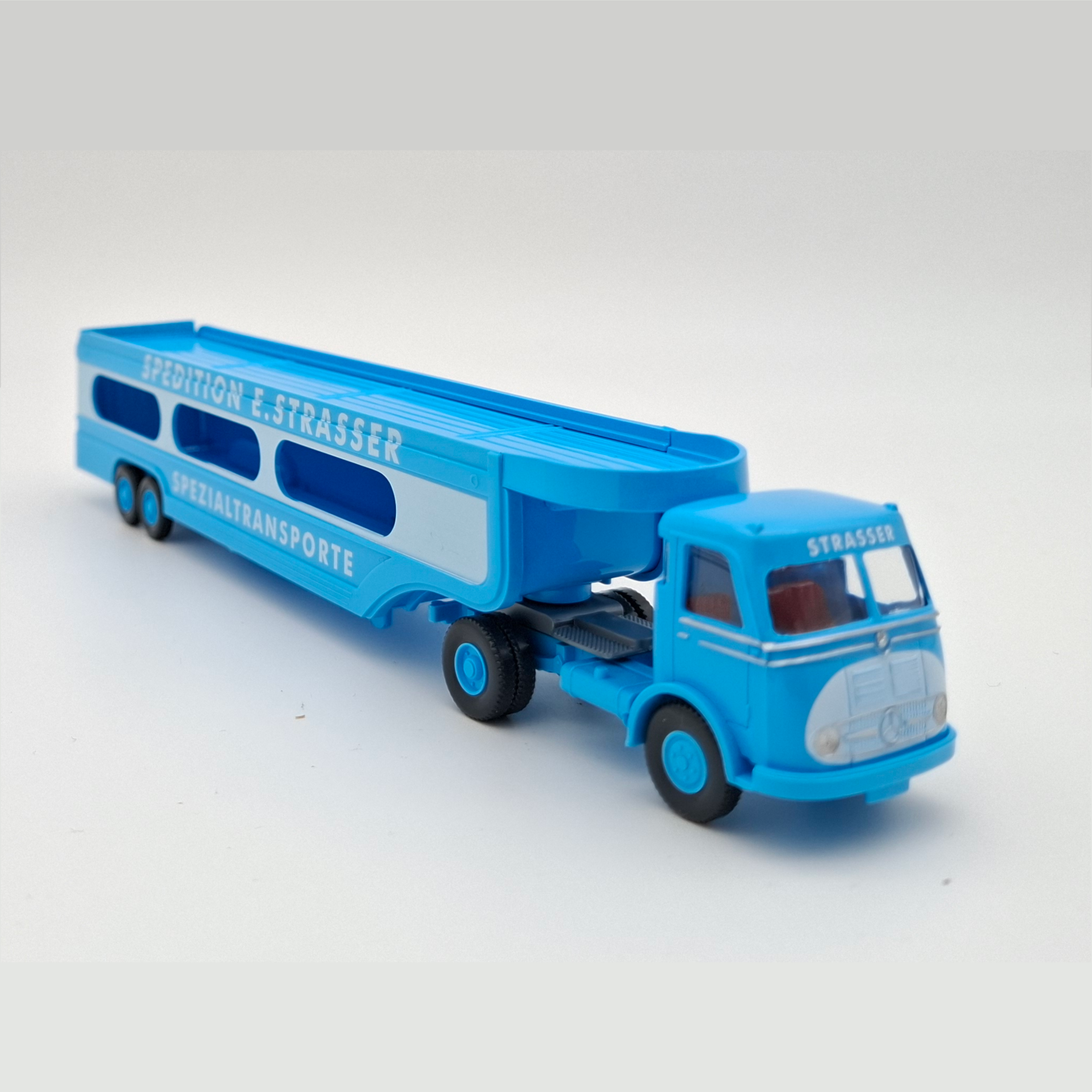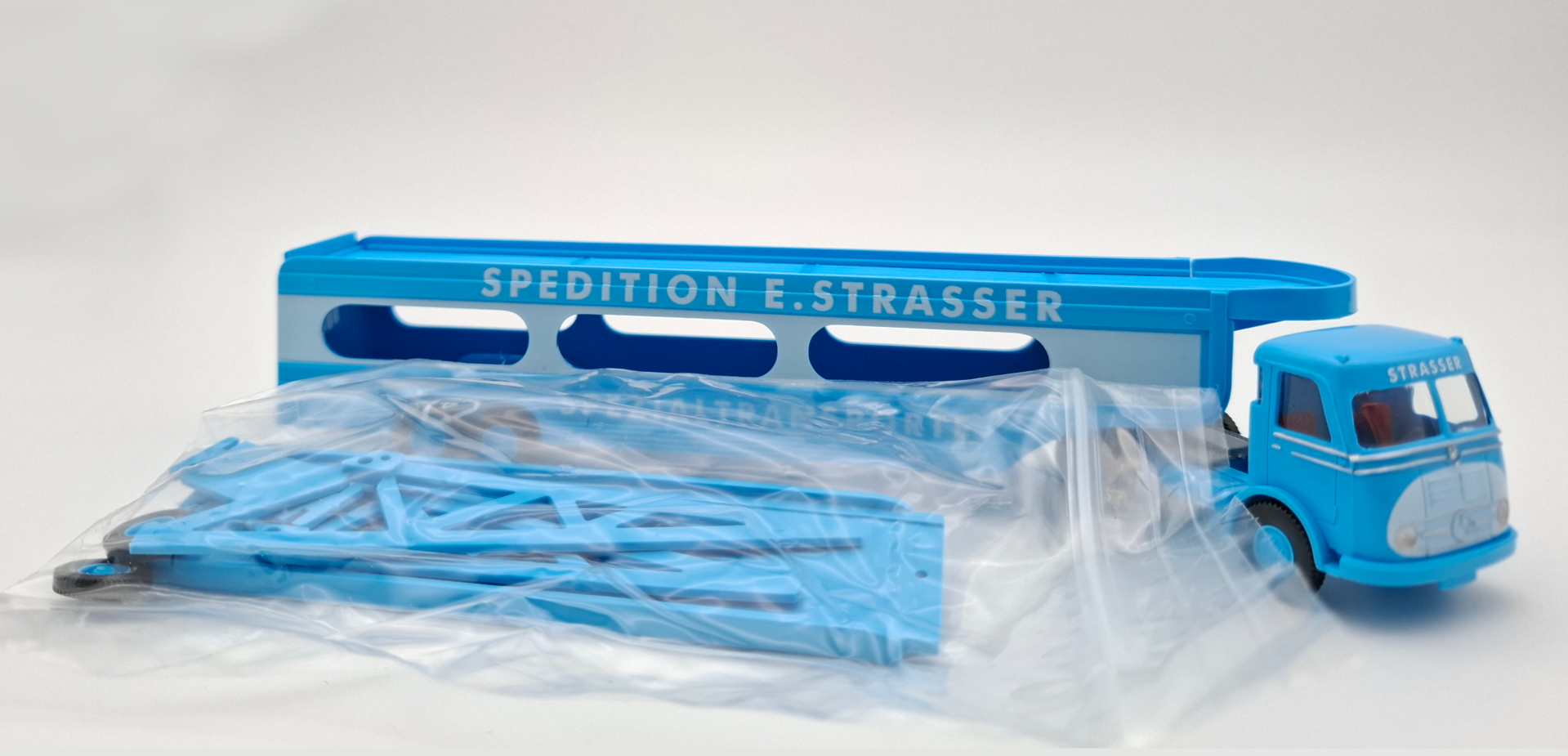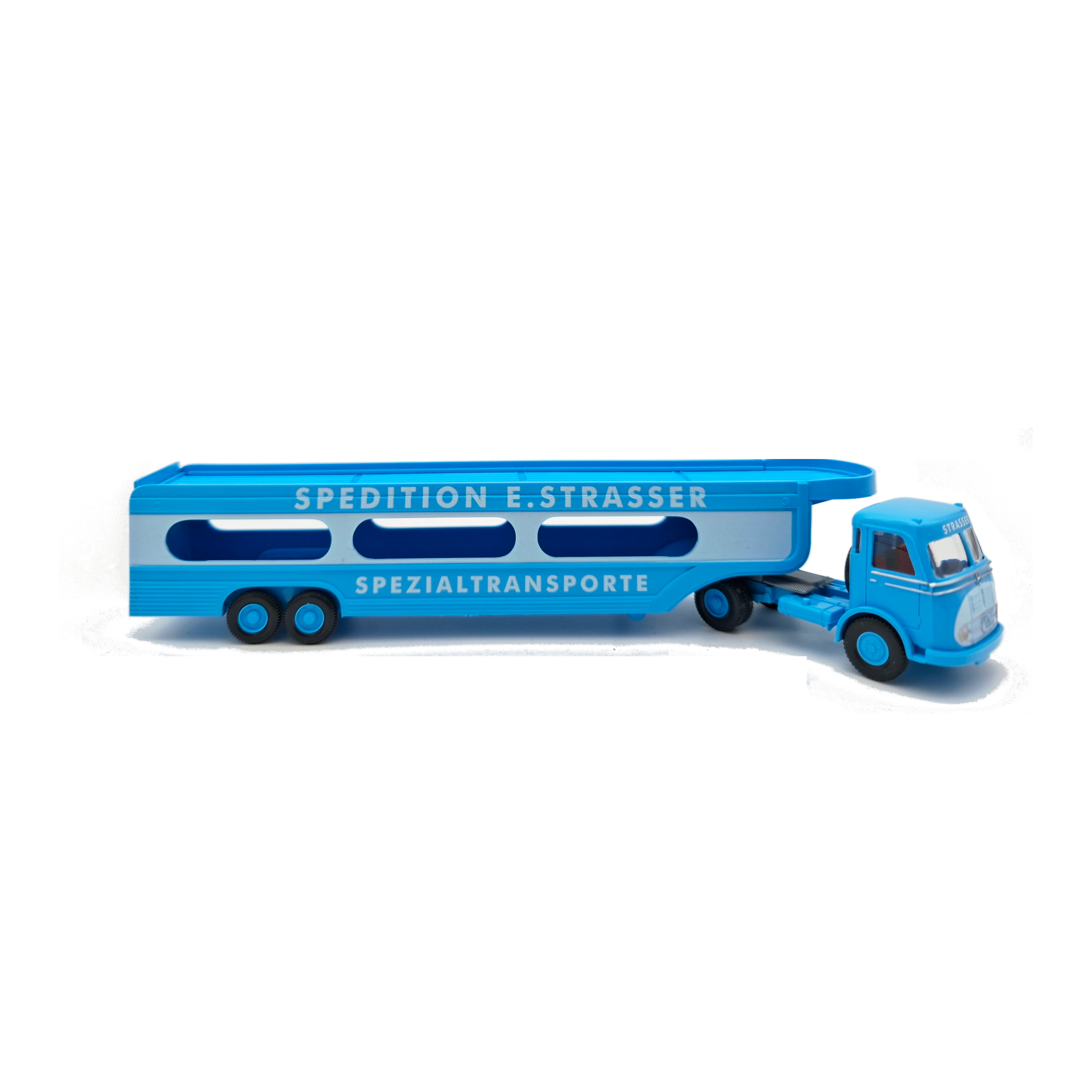 De Wiking 058049 is een echte blikvanger op iedere modelbaan. Deze fraai uitgevoerde autotransporter van Spedition E. Strasser straalt kracht en nostalgie uit. Met zijn opvallende lichtblauwe kleurstelling en de markante opdruk Spezialtransporte roept hij de sfeer op van een tijd waarin vervoer nog pure ambacht was. Het model combineert een stoere uitstraling met fijne details, waardoor hij niet alleen voor verzamelaars, maar ook voor liefhebbers van authentiek transport een absolute must-have is.